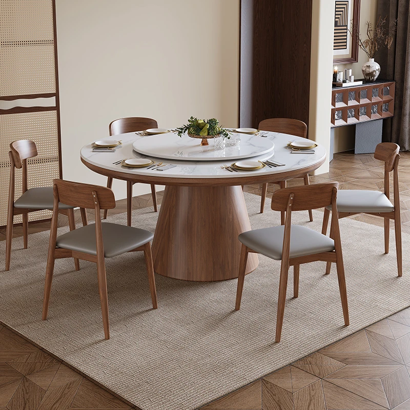 Elegant Oak Home: Solid Wood Rock Slab Dining Table and Chair Set – Versatile Expandable Round Table with Foldable Design for a Touch of Modern Vintage Luxury Dining Experience.