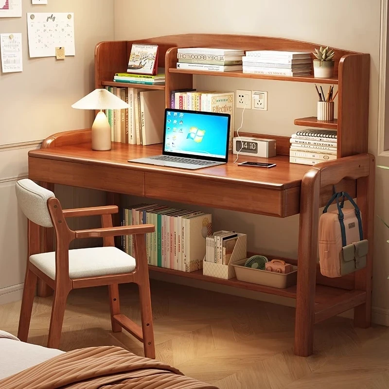 "Elegant Solid Wood Desk with Bookshelf - Adjustable Study Table for Students and Home Use - Perfect for Home Offices and Bedrooms"