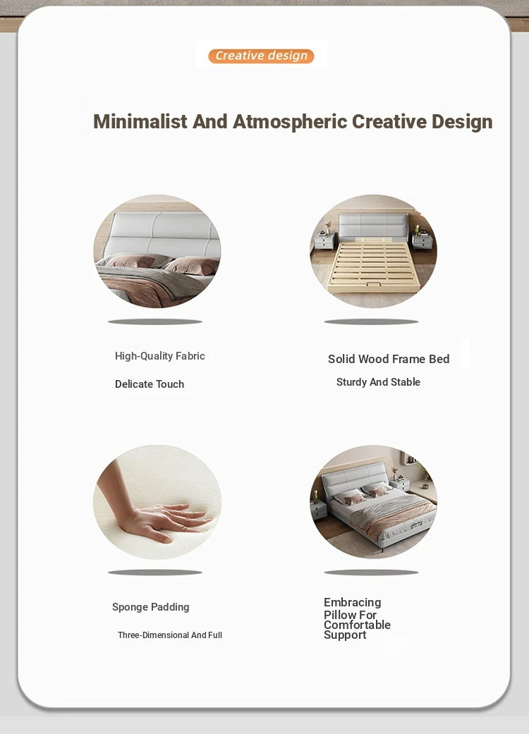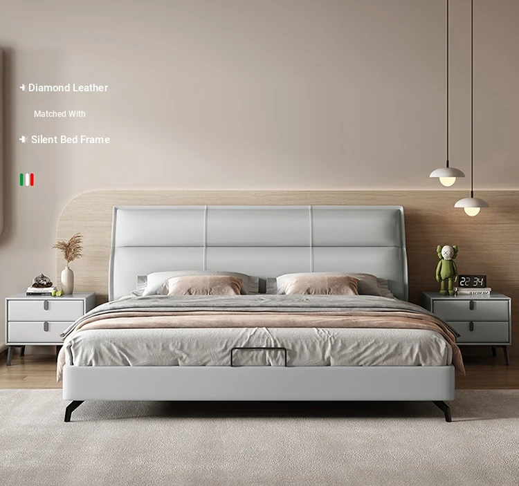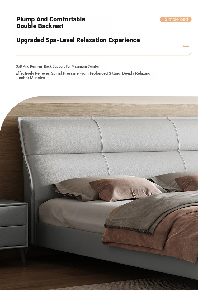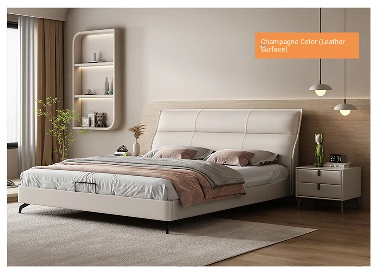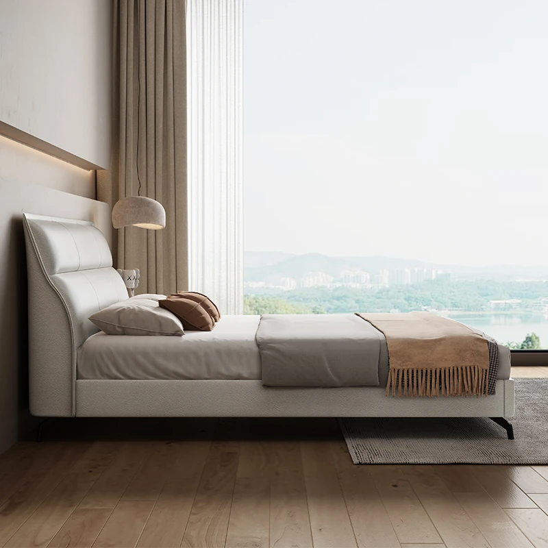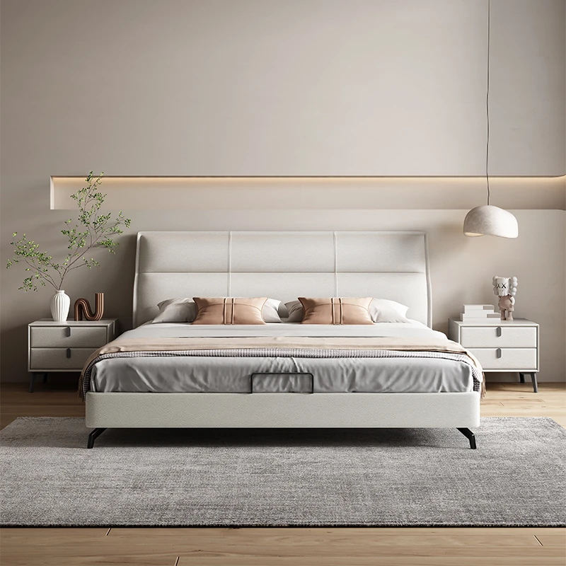 Elegant Italian Design Solid Wood Leather Bed - Modern Minimalist Luxury Double Bed for Master Bedroom, Cream Color