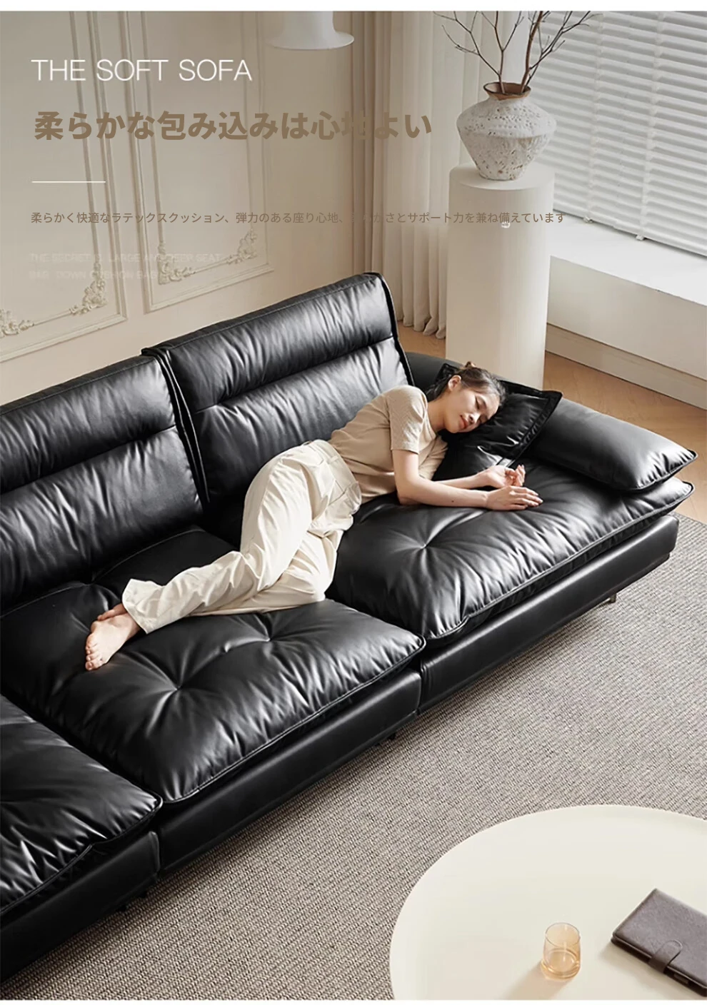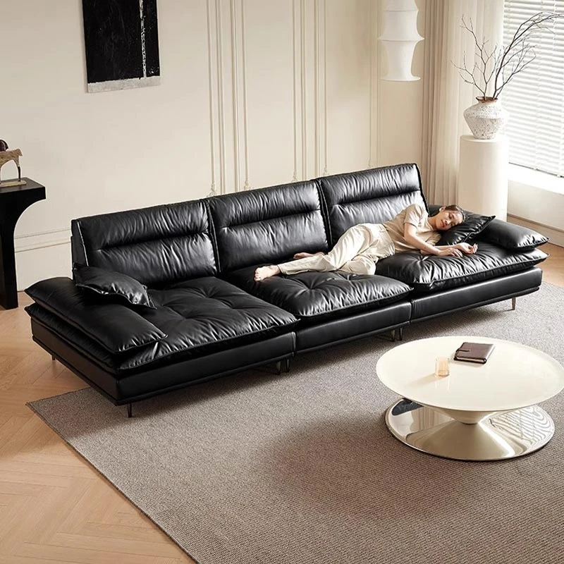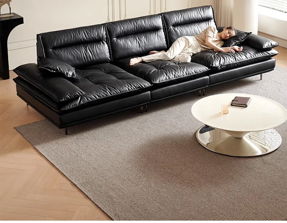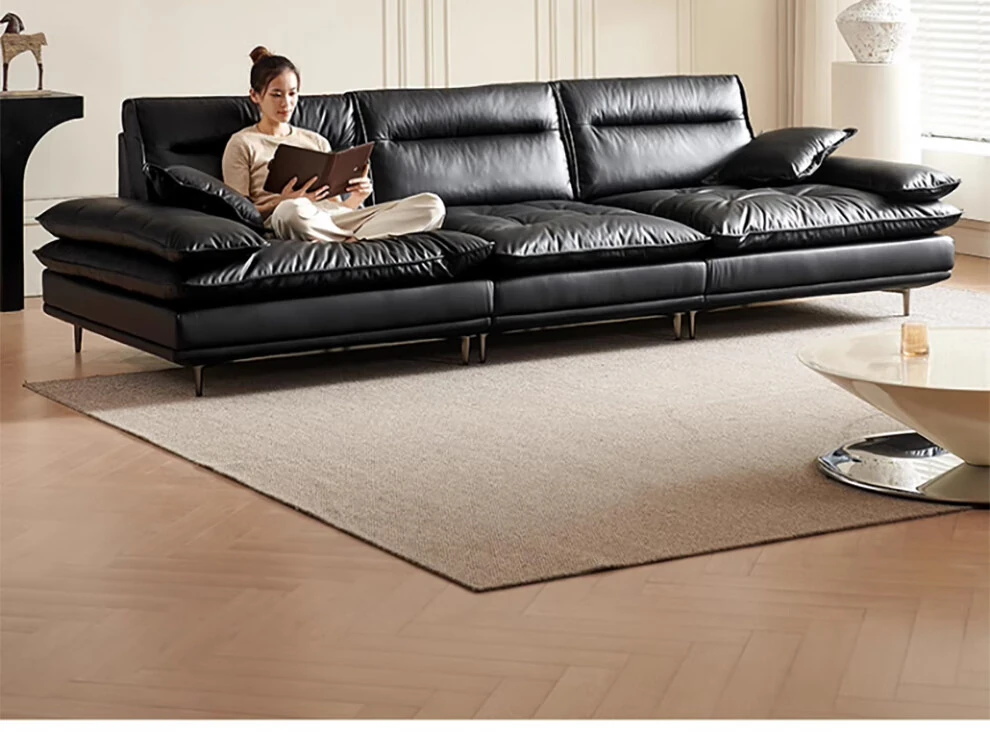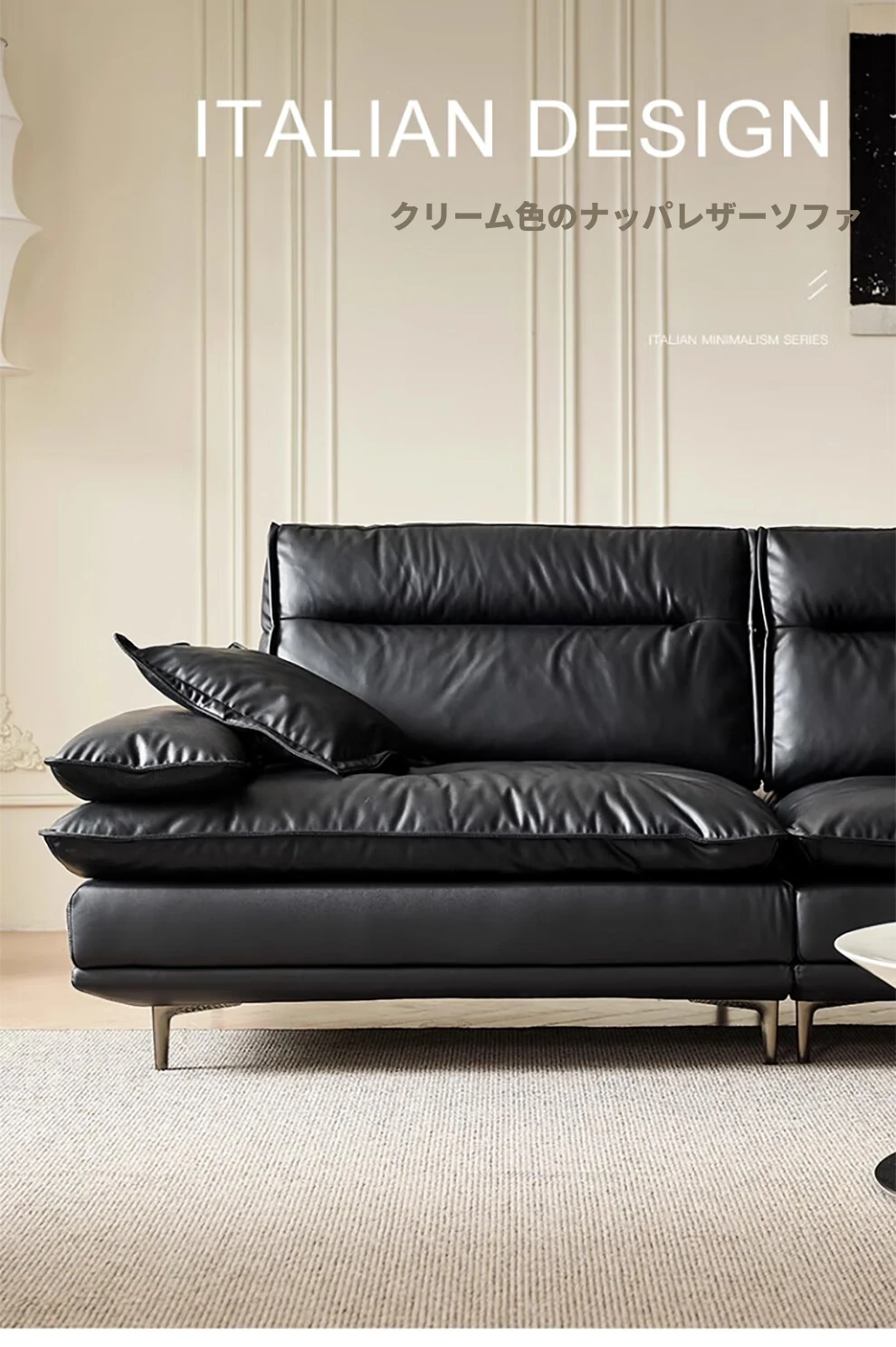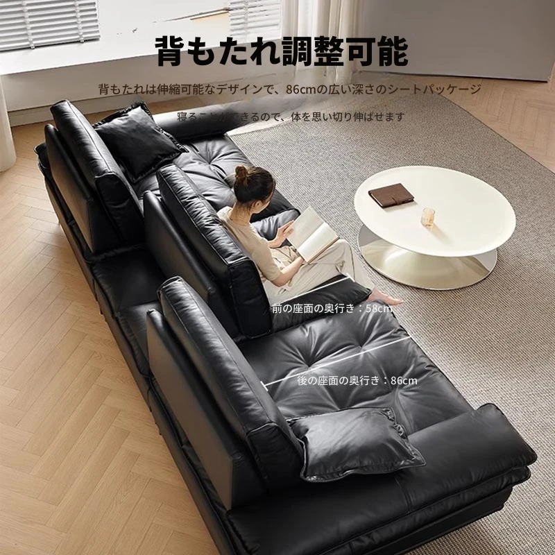 当店特选!深い座り心地と広々とした空間を実現する、移動可能な背もたれ付きの本革ソファ。洗練されたイタリアンスタイルで、リビングに上質な贅沢をプラス。ブラックレザーの美しさを体感してください!