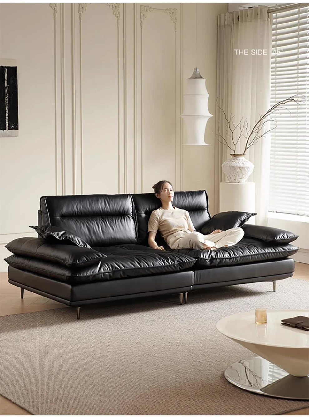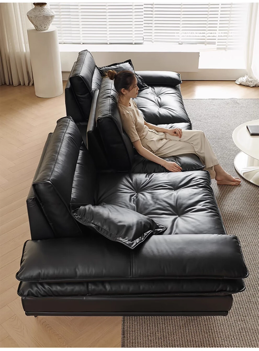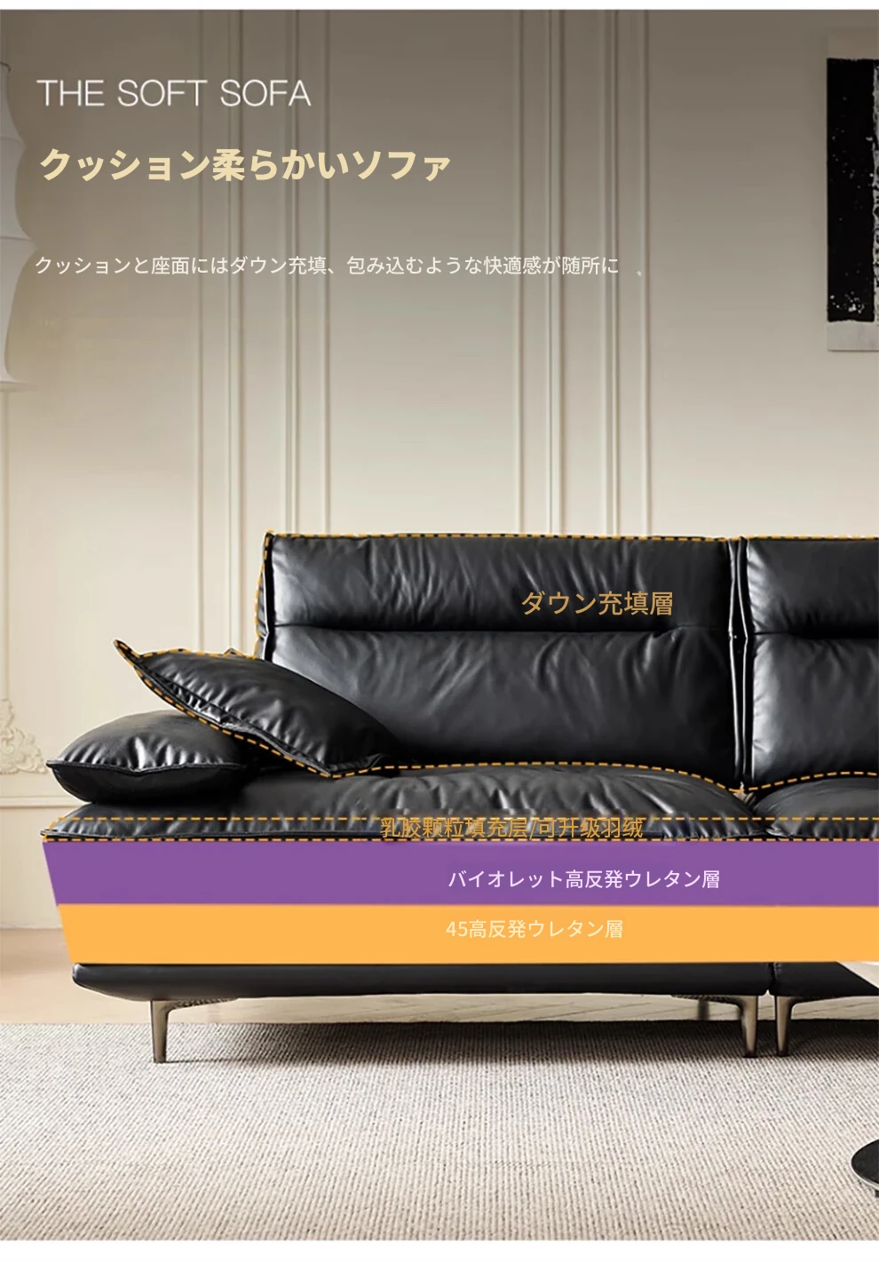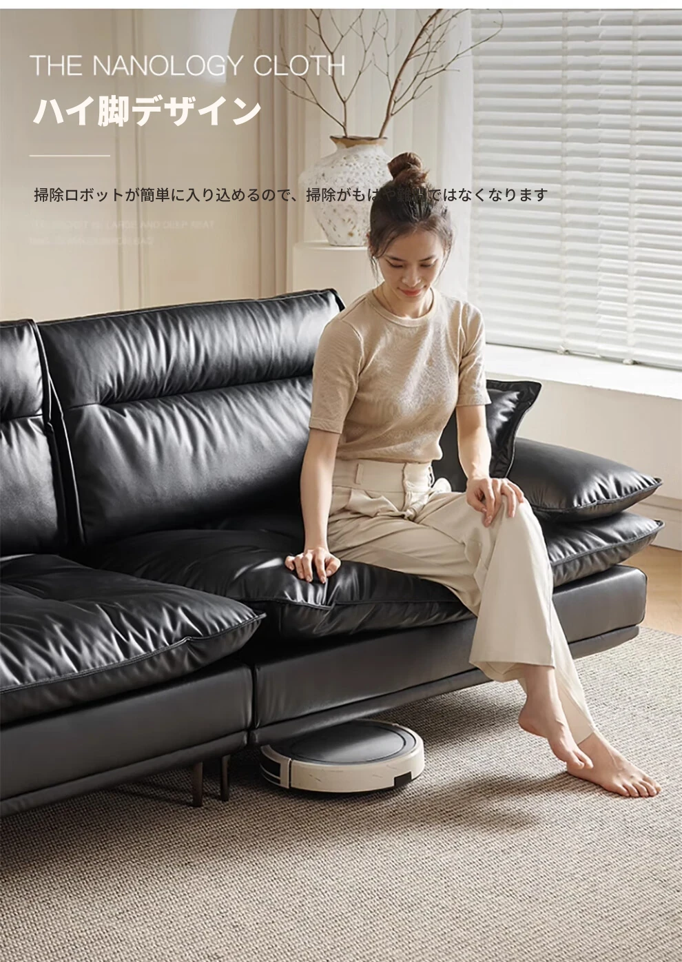 当店特选!深い座り心地と広々とした空間を実現する、移動可能な背もたれ付きの本革ソファ。洗練されたイタリアンスタイルで、リビングに上質な贅沢をプラス。ブラックレザーの美しさを体感してください!