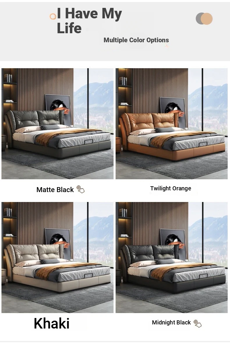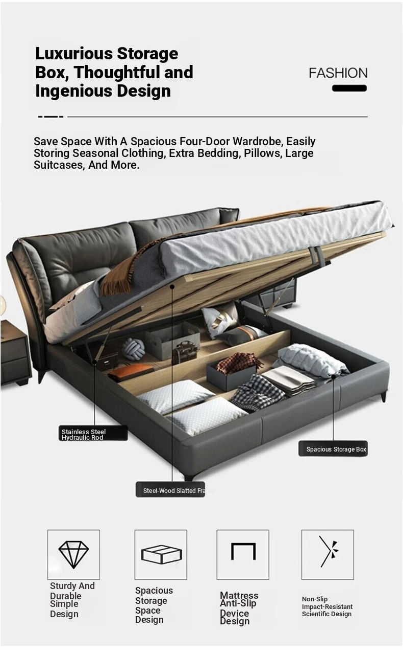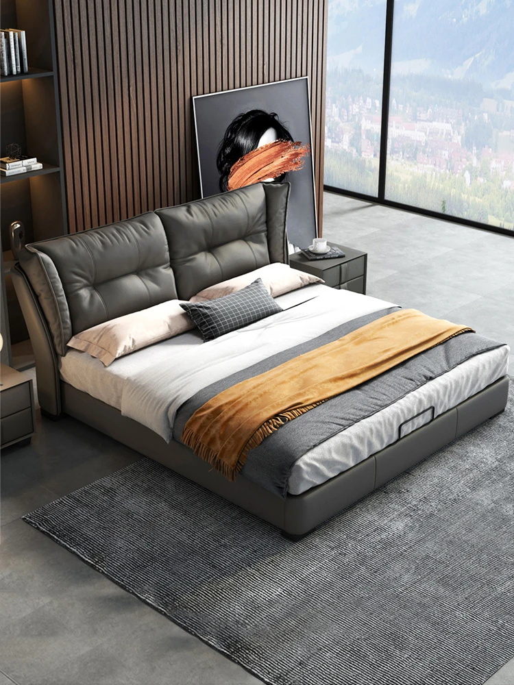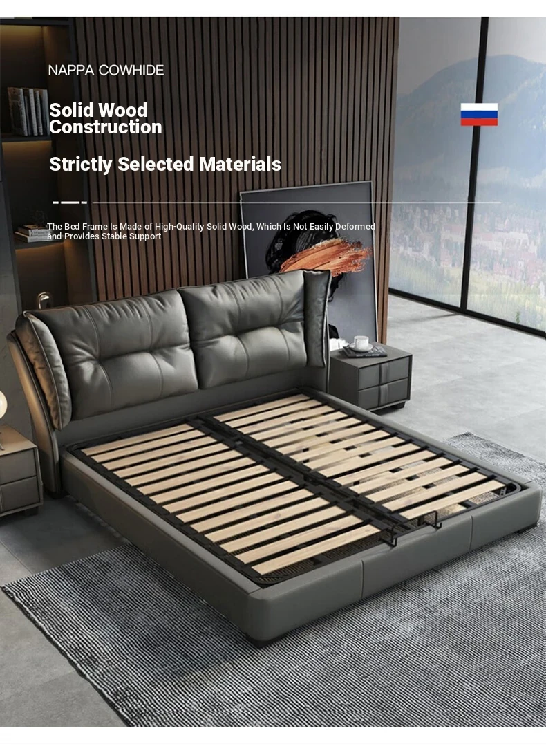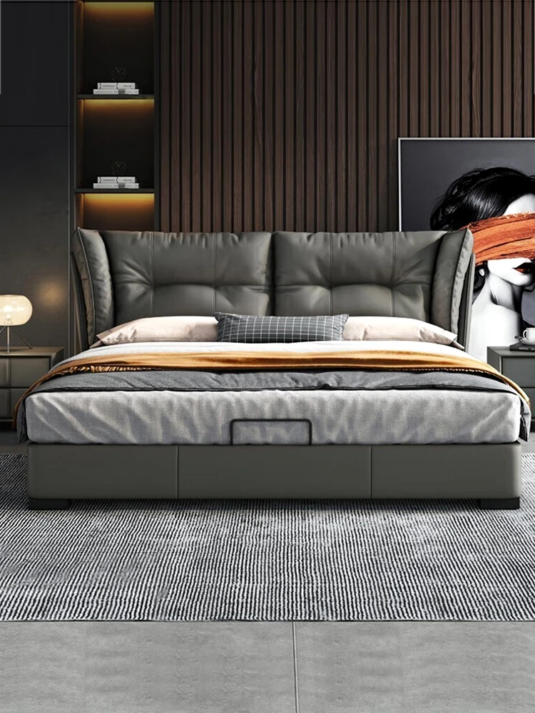Minimalist Italian Genuine Leather Bed - Modern Luxury High-Storage Double Bed for Small Bedrooms - Perfect for Newlyweds and Chic Home Decor.