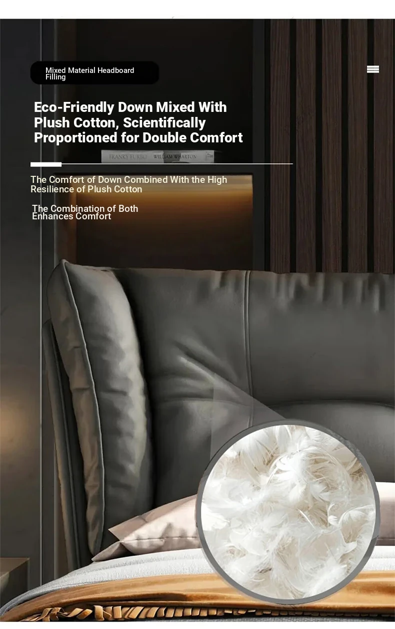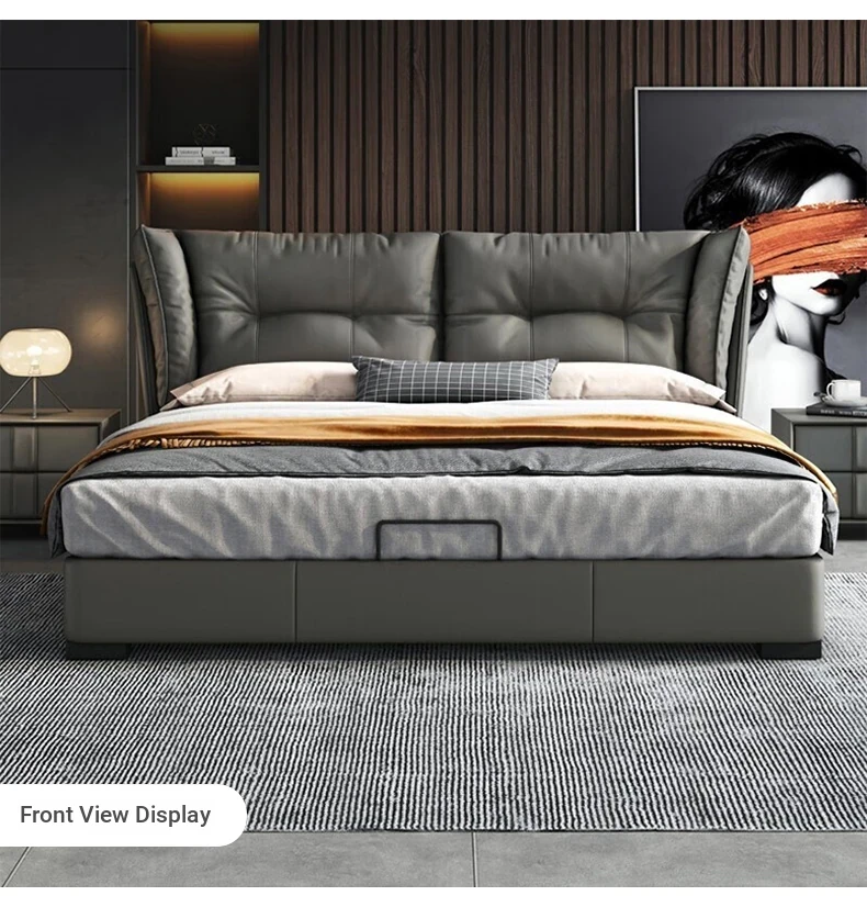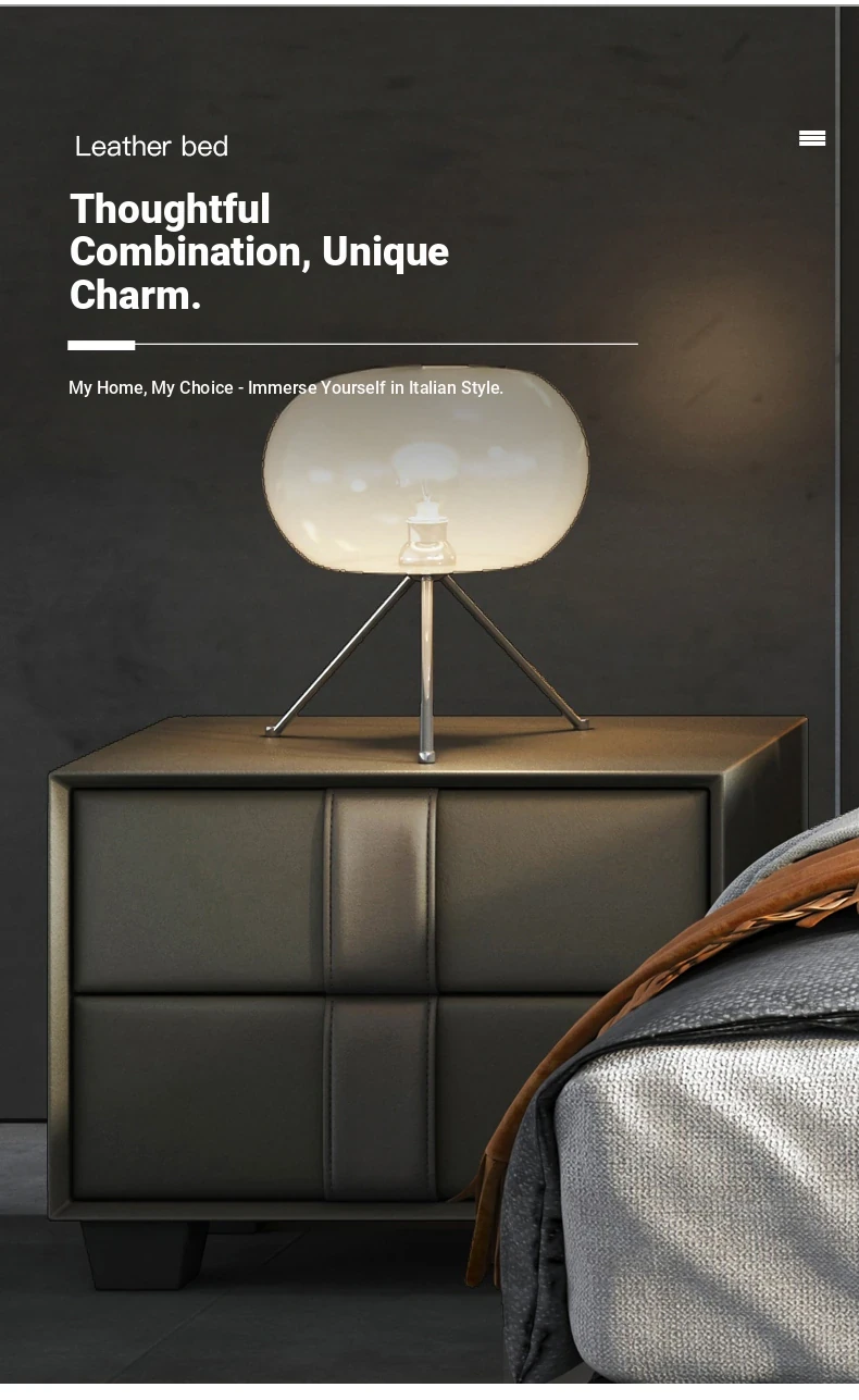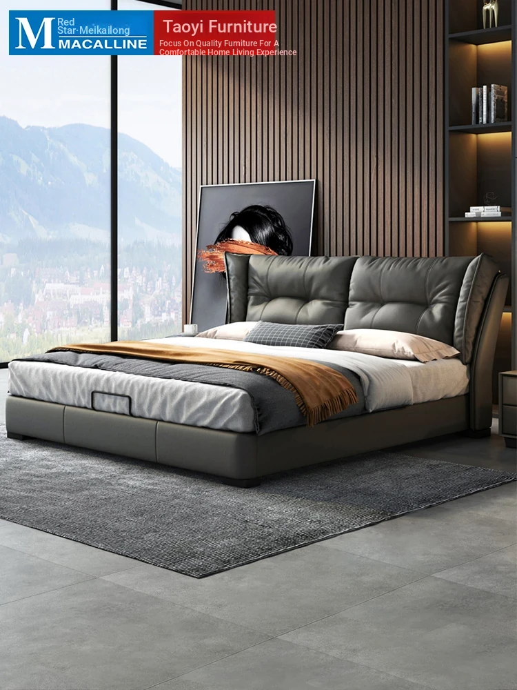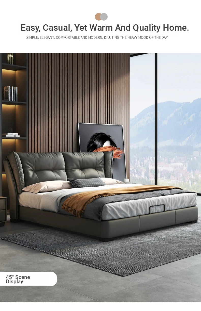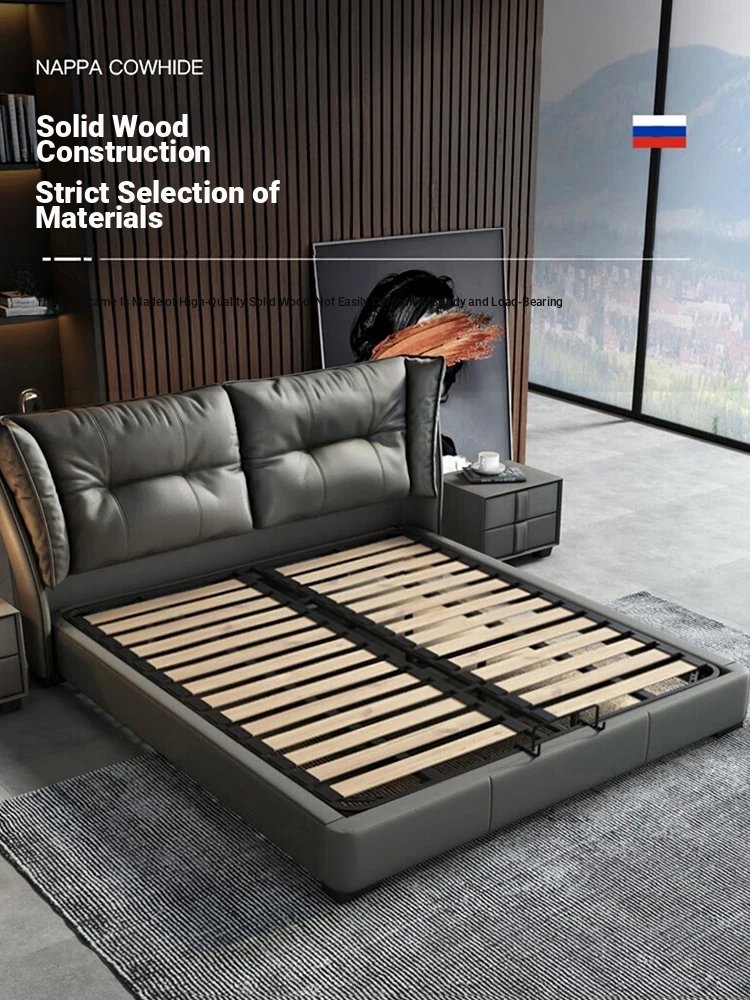 Minimalist Italian Genuine Leather Bed - Modern Luxury High-Storage Double Bed for Small Bedrooms - Perfect for Newlyweds and Chic Home Decor.