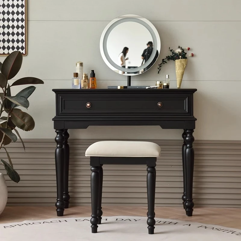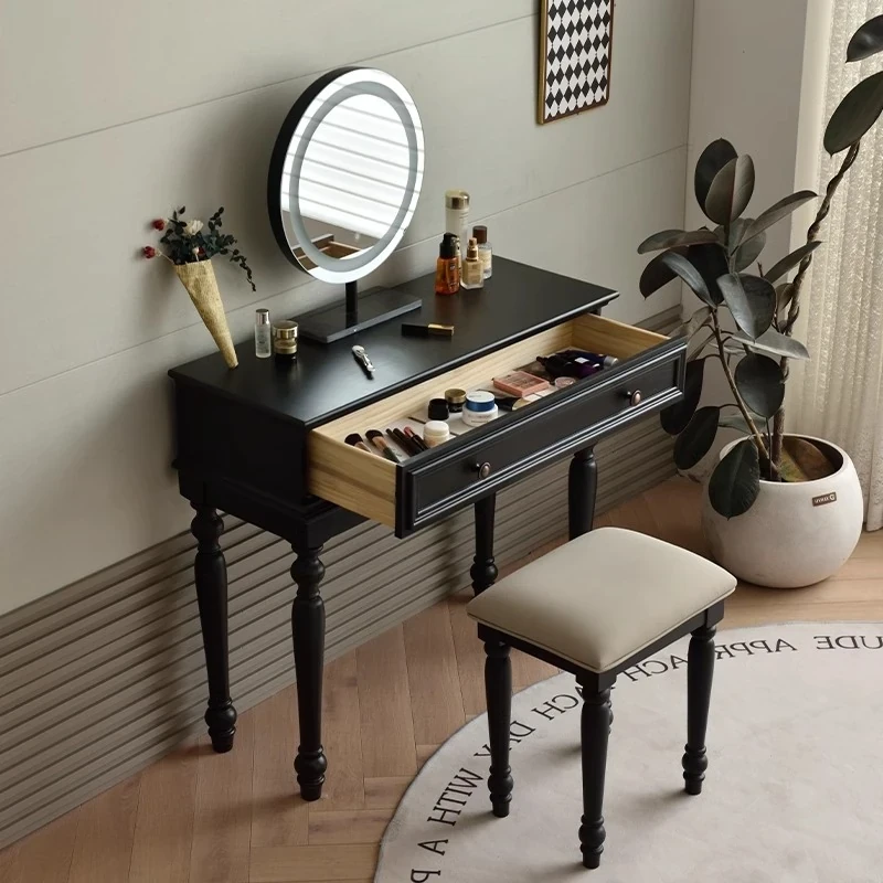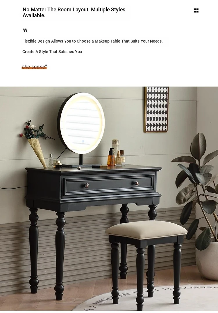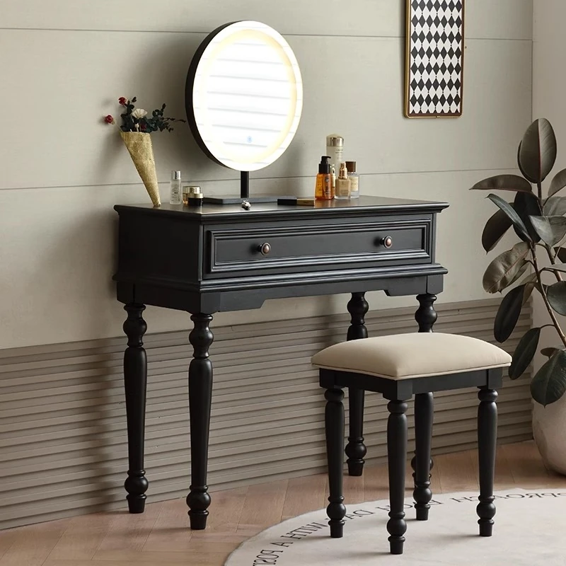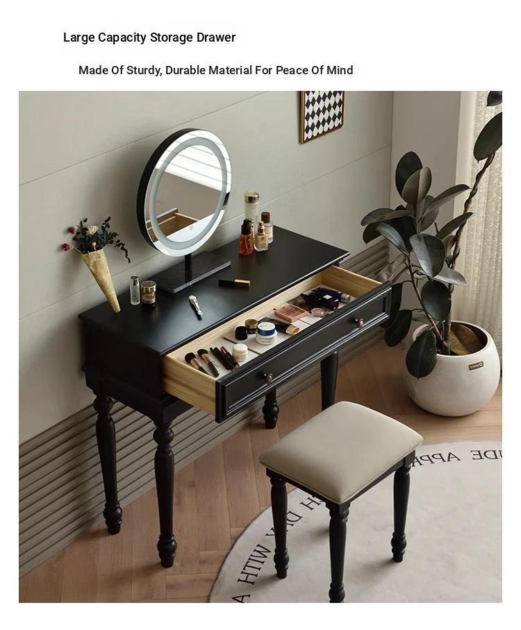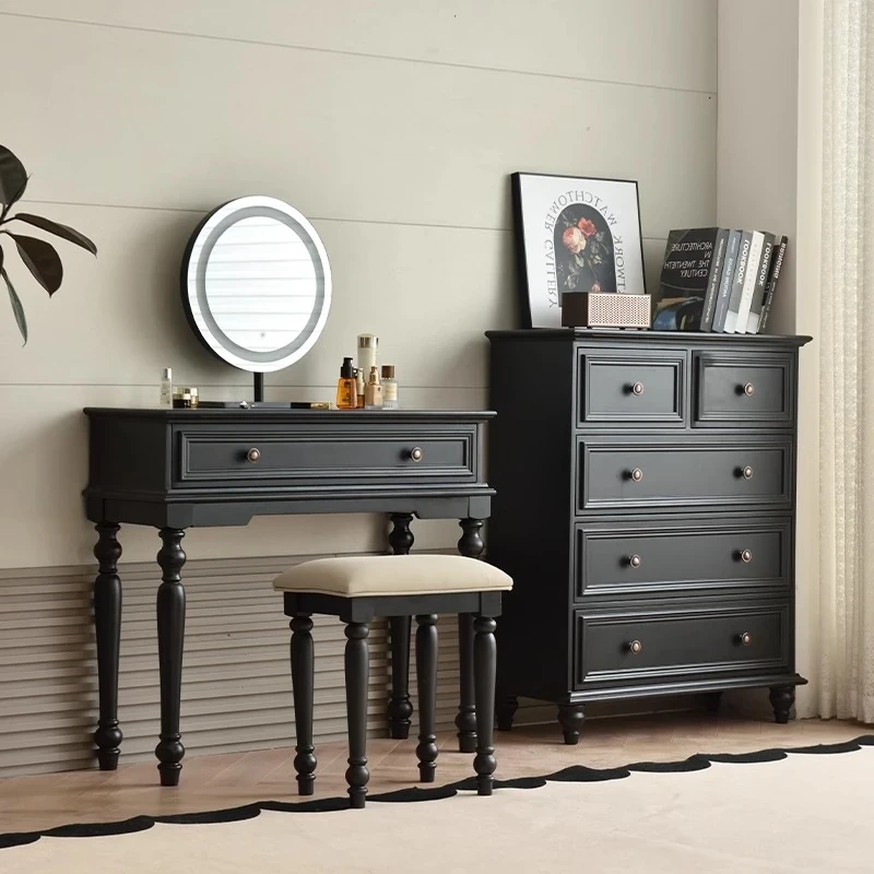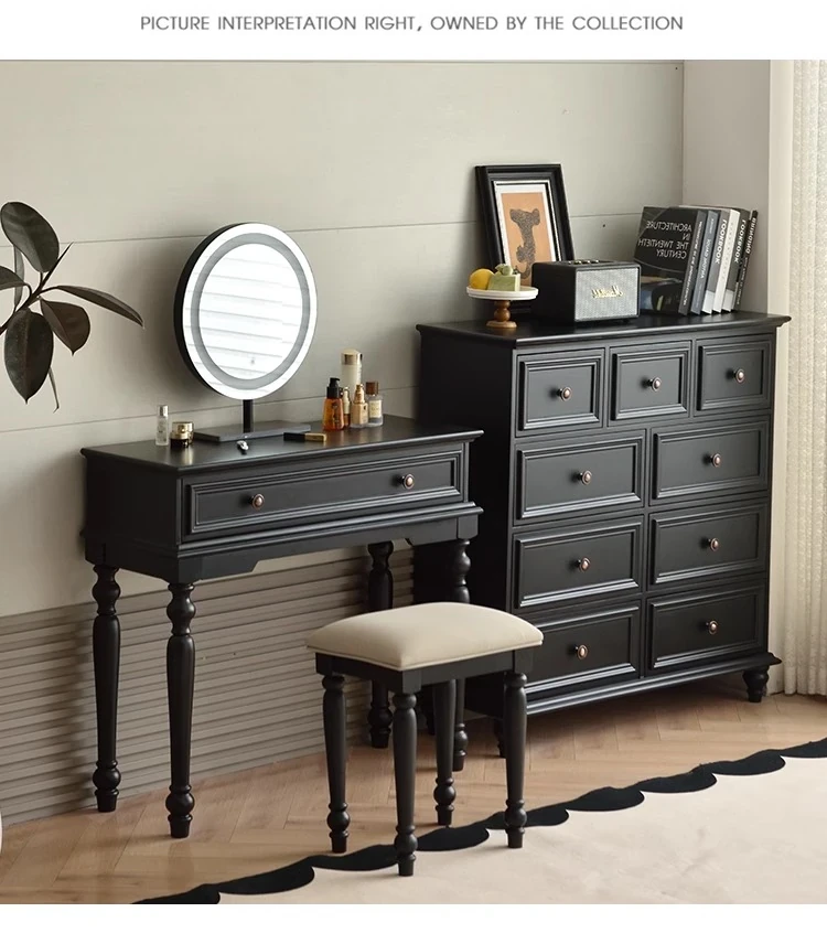 サンパリオ アメリカンヴィンテージ 木製 化粧台 コンパクト サイズ ブラック フレンチスタイル 高級収納 一体型キャビネット で、おしゃれな寝室を演出!あなたの美を引き立てるアイテムです。