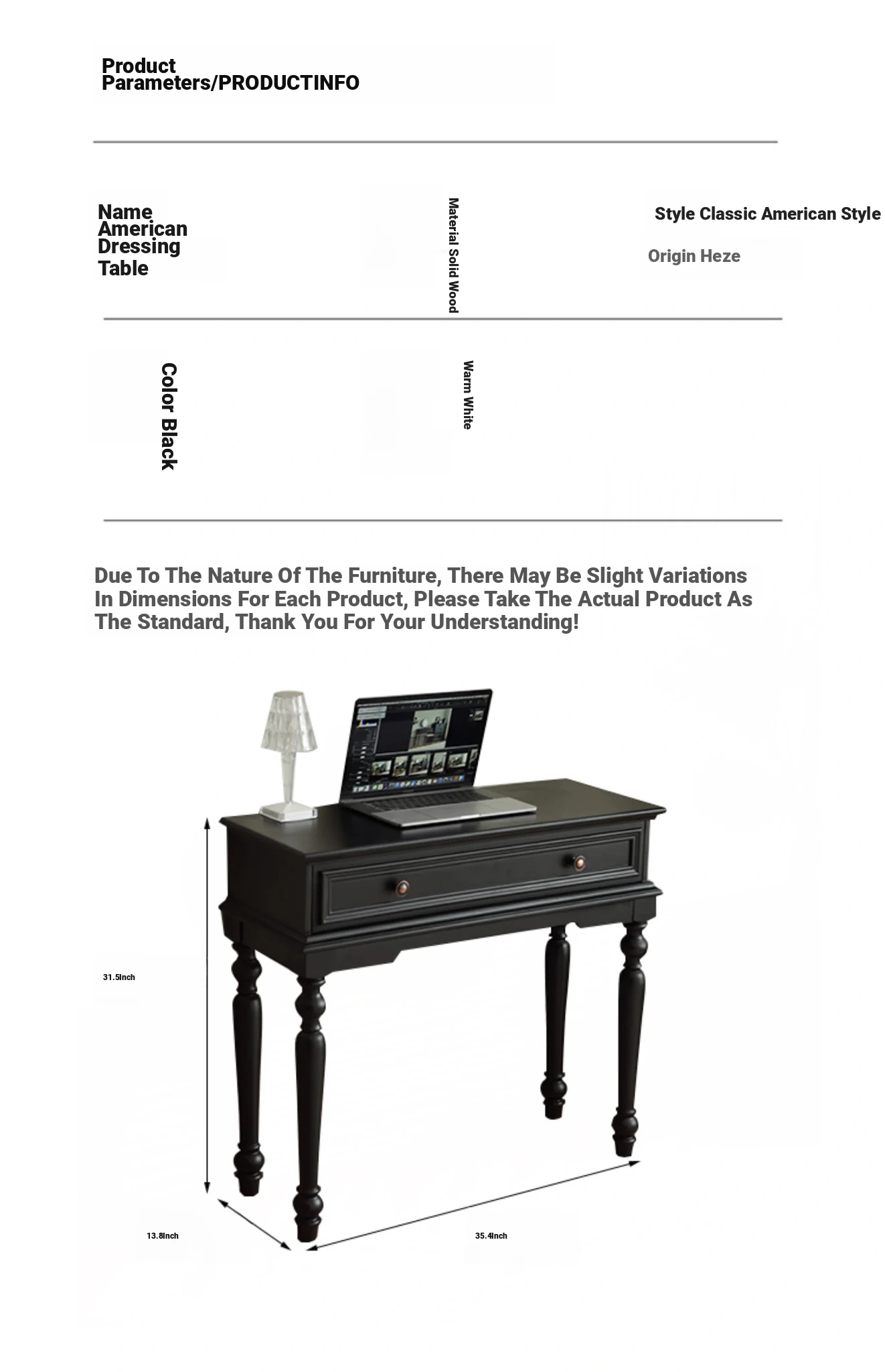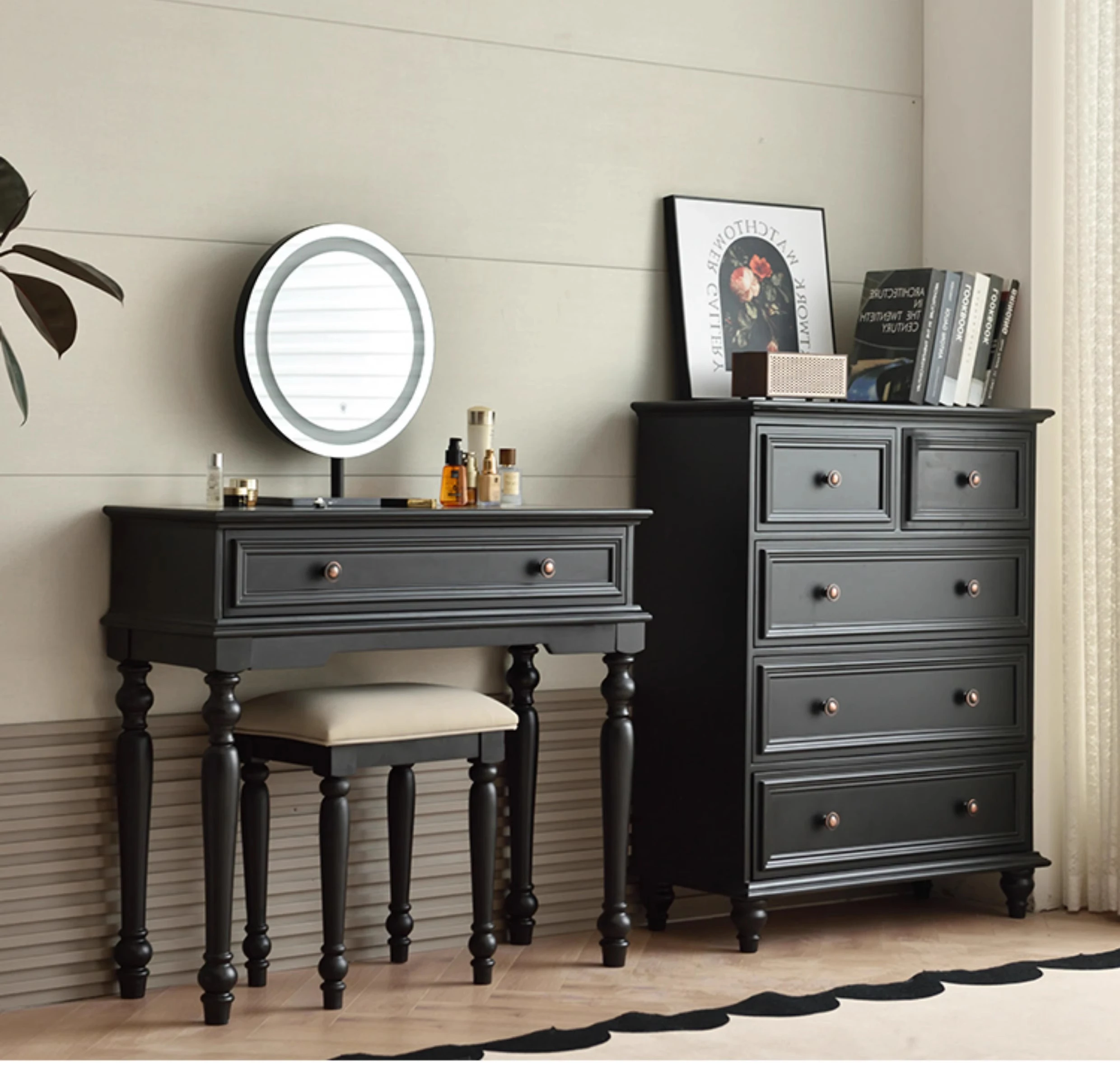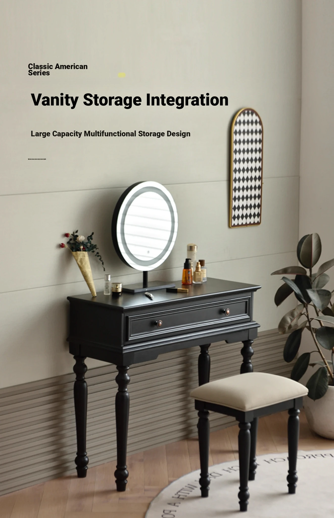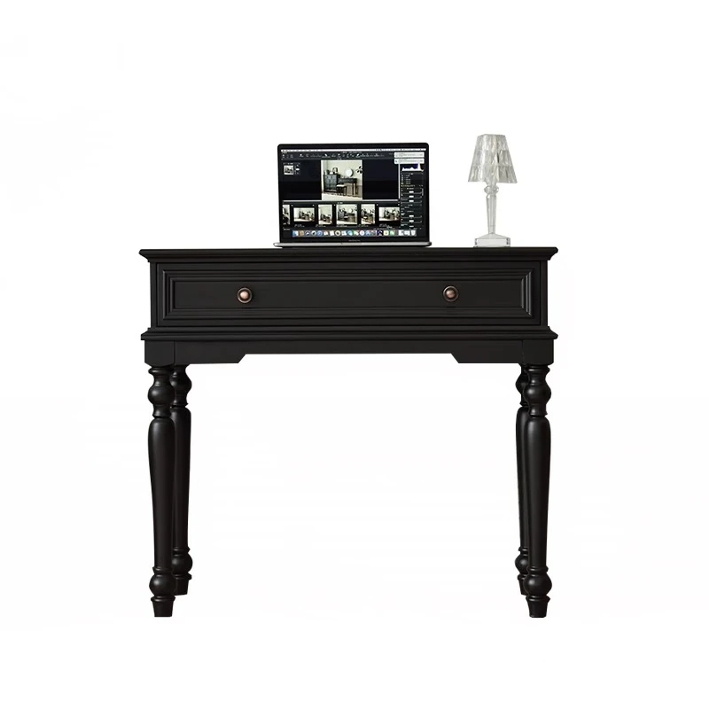 サンパリオ アメリカンヴィンテージ 木製 化粧台 コンパクト サイズ ブラック フレンチスタイル 高級収納 一体型キャビネット で、おしゃれな寝室を演出!あなたの美を引き立てるアイテムです。